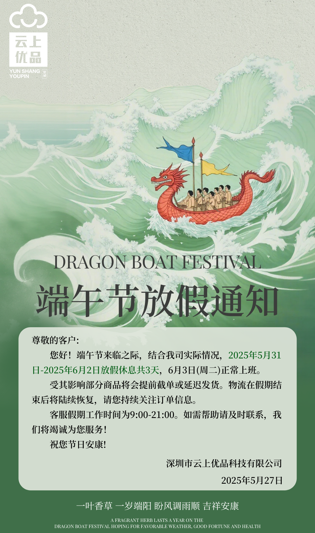 各位小伙伴注意啦!粽子已备好,龙舟已就位云上优品也要放个“粽”假啦~放假时间:5月31日-6月2日节后满血回归:6月3日 温馨提示:• 节前订单抓紧啦祝大家:粽是快乐粽是幸福粽是心想事成